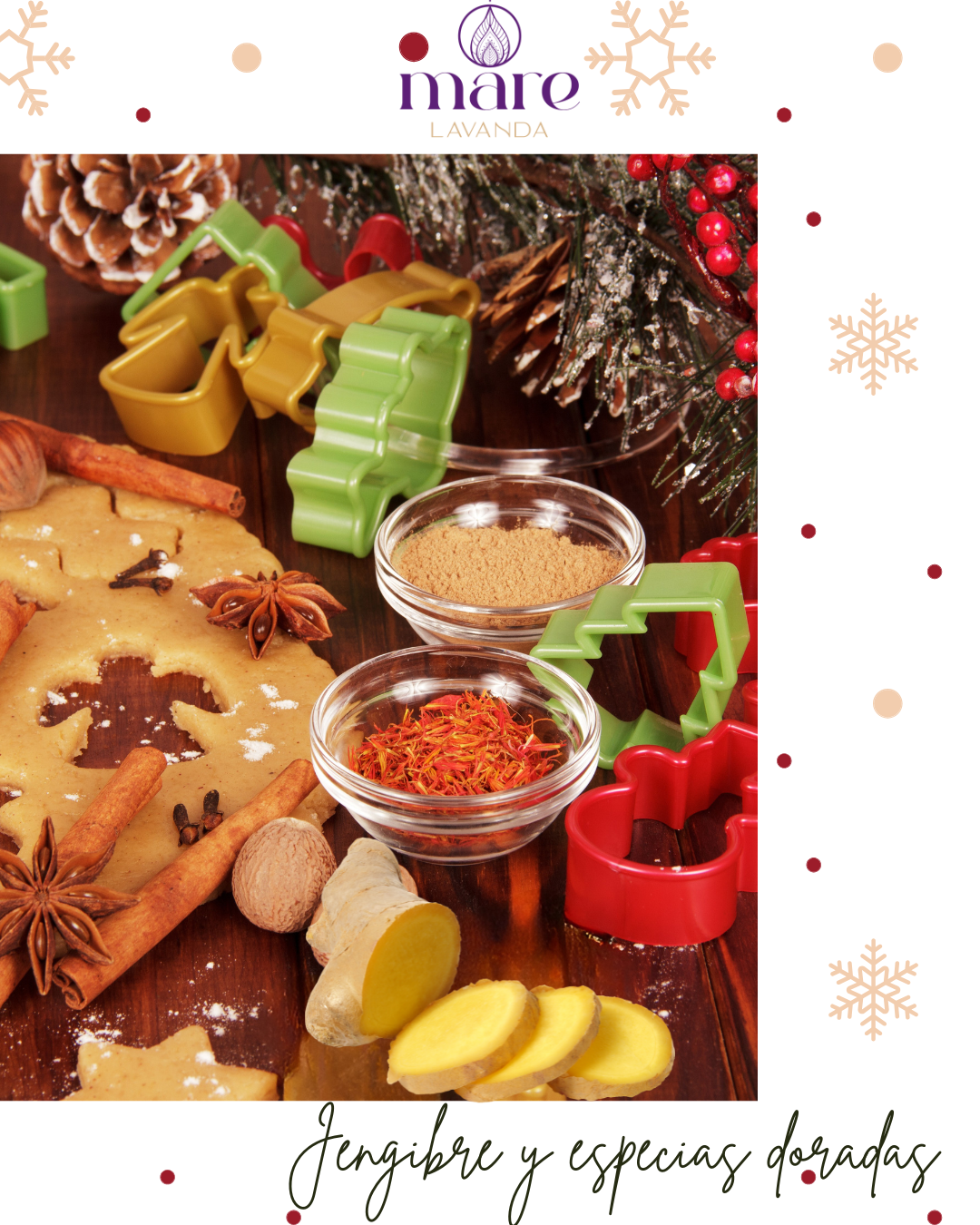 Esta fragancia evoca sentimientos de calidez, familia y, por supuesto, un antojo de dulces. Te transporta a las fiestas decembrinas de antaño, con los ricos aromas de algo delicioso que se prepara en la cocina. El jengibre cristalizado predomina sobre una mezcla de especias como canela, clavo, nuez moscada y pimienta de Jamaica, con toques cítricos y un ligero toque de dulzor avainillado.